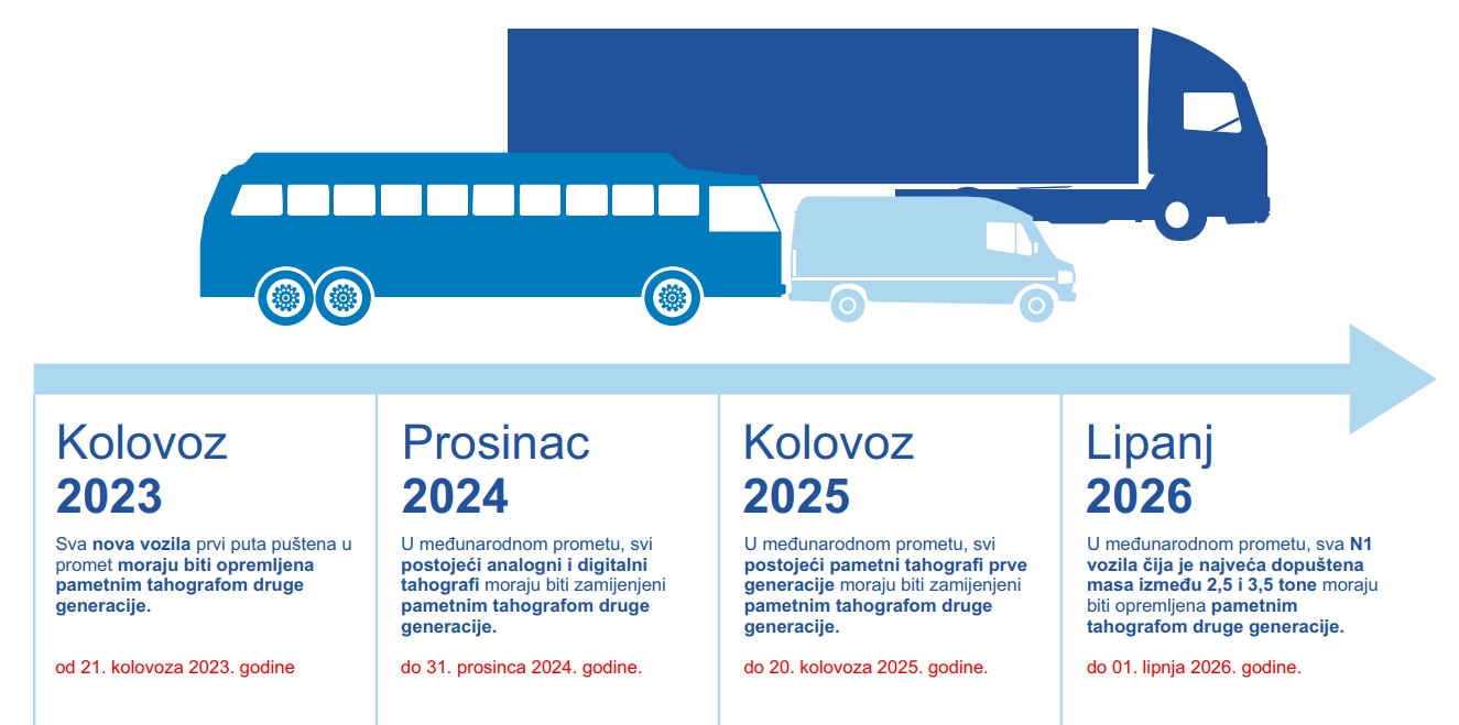 • najkasnije do 01. lipnja 2026. godine, sva gospodarska vozila u međunarodnom prometu čija je najveća dopuštena masa između 2,5 i 3,5 tona moraju ugraditi pametni tahograf 2. generacije (ova vozila sada u EU uopće nisu opremljena tahografima)