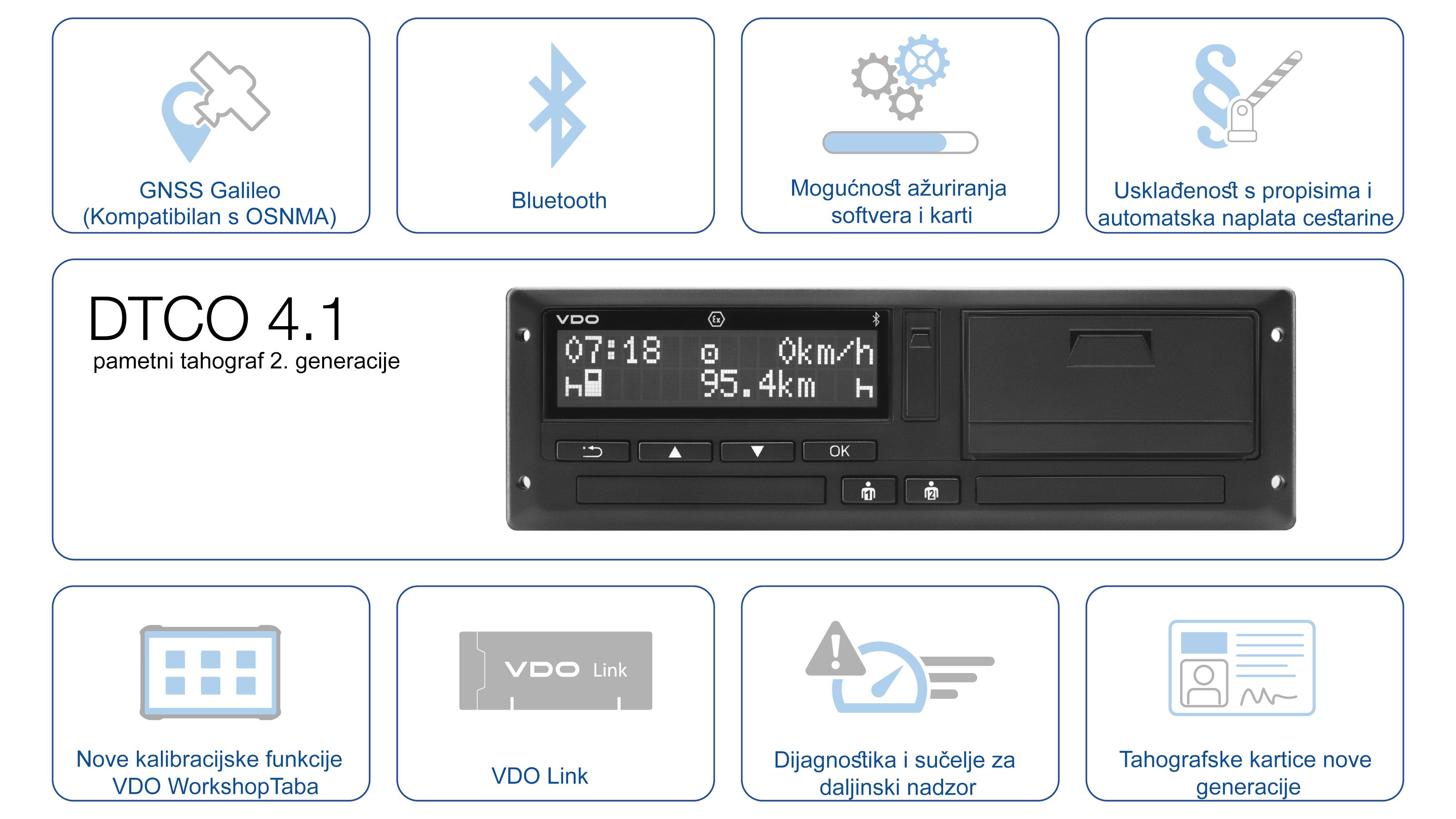 Svi novi elementi pametnog tahografa 2. generacije: Galileo GNSS s OSNMA autentifikacijom, Bluetooth veza, nadogradnja operativnog programa i karata, sukladnost s trenutno važećim i budućim pravilima o radnim aktivnostima vozača, mogućnost plaćanja cestarine pomoću VDO Linka, nova generacija tahografskih kartica je u pripremi – G2V2, daljinska dijagnostika, veza s VDO Link uređajem, nove mogućnosti podešavanja VDO Workshop Tabletom